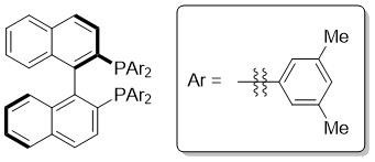 ※15 (*R*)-(+)-XylBINAP:下図のような構造をしている配位子。パラジウム触媒が中央の2個のリン(P)原子に配位することで、ポケットのような空間ができ、そこで化学反応が行われる。Ar基(ベンゼン環などから誘導される芳香族炭化水素)がPh基(ベンゼン環のこと)のものは、BINAP(2,2'-ビス(ジフェニルホスフィノ)-1,1'-ビナフチル)と呼ばれ、野依良治博士(平成13年(2001年)ノーベル化学賞受賞)らにより開発されている。