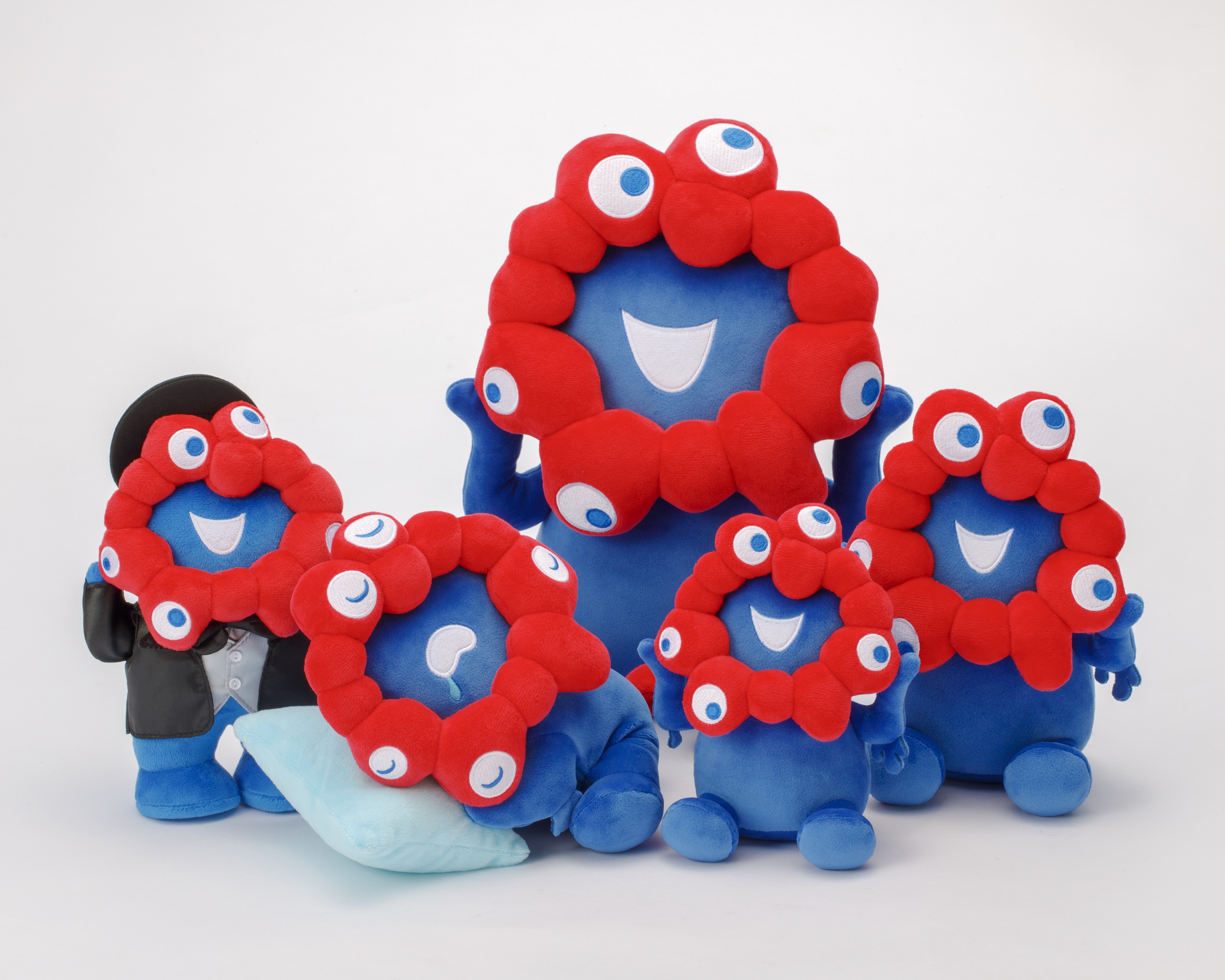 お土産の定番品であるぬいぐるみはもちもち素材にこだわりミャクミャクのポーズやコスチュームのバリエーションも豊富に約10種類を販売します。