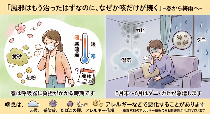 花粉,黄砂,寒暖差,連休中の生活リズムの乱れなど,さまざまな要因が重なって,咳や息苦しさが長引くことがあります。さらに5月末~6月になると,今度は日本中がジメジメしてきます。すると家庭内には急激にダニやカビが増えるのです。