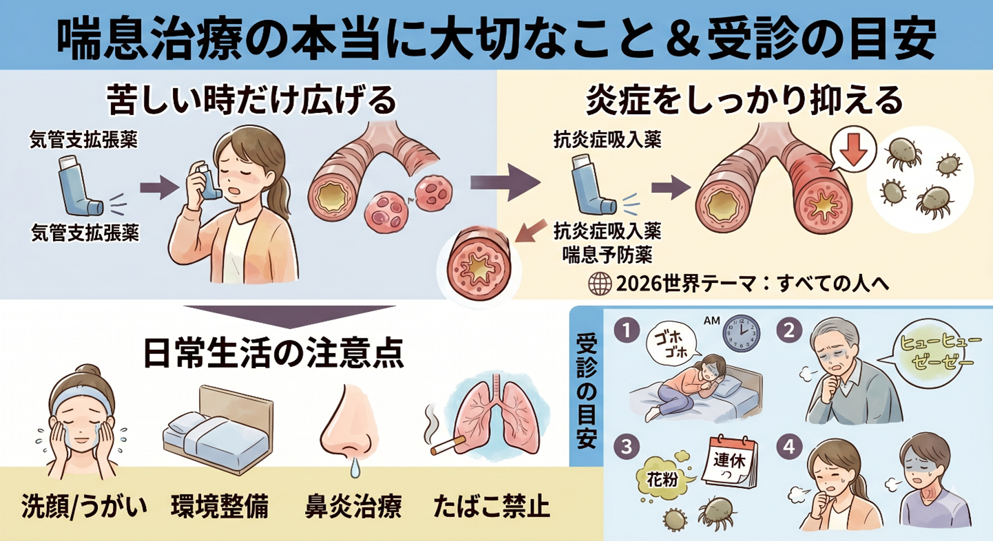 喘息で大切なのは,「苦しい時だけ広げる」よりも,「炎症をしっかり抑える」という考え方です。