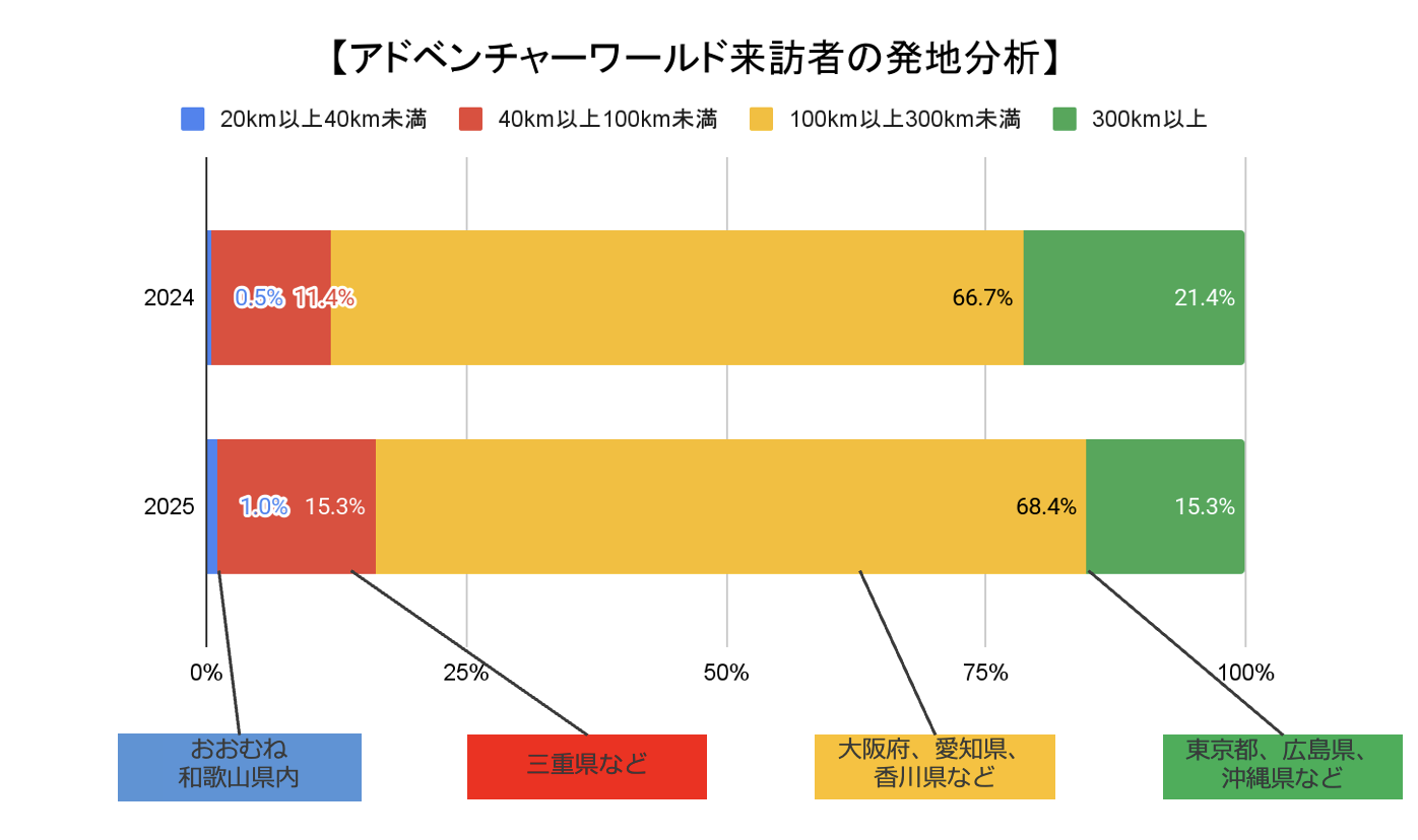 アドベンチャーワールド来訪者の発地(推定居住エリア*)からアドベンチャーワールドまでの距離を分析したところ、以下のような結果でした。全ての距離帯からの来場者が絶対数として増加した中で、近距離・中距離からの来場者の増加率が相対的に高かったとみられます。