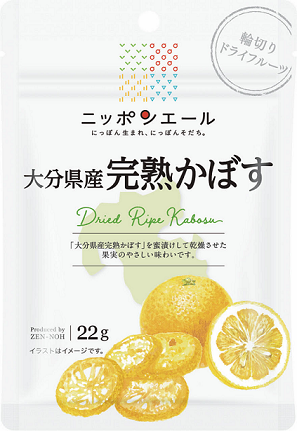 完熟かぼすドライフルーツは、大分県産の黄色く完熟したかぼすを使用した半生仕上げのドライフルーツです。完熟して黄色くなった「かぼす」は広域での流通が難しく、ほとんどが県内で消費され、一部には収穫されないまま放置される圃場もあります。このような問題を解決するべく、完熟した「かぼす」の甘味が増し、酸味が控えめになる特性を活かし、広域に流通できる形にして商品化しました。