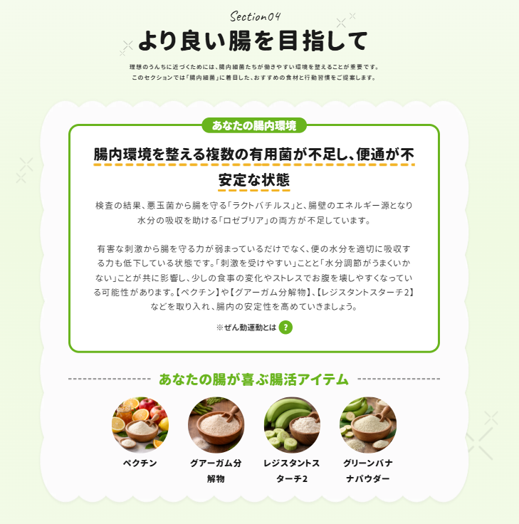 便の状態と腸内細菌の傾向を踏まえ、おすすめの腸活アイテムや生活習慣を提示します。今日から取り入れやすい行動として実践できます。