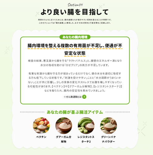 本コンテンツは、便通乱れに悩む人が自分の状態を知り、腸内フローラ検査結果を踏まえて、自分に合った対策を見つけるための4ステップで構成されています。