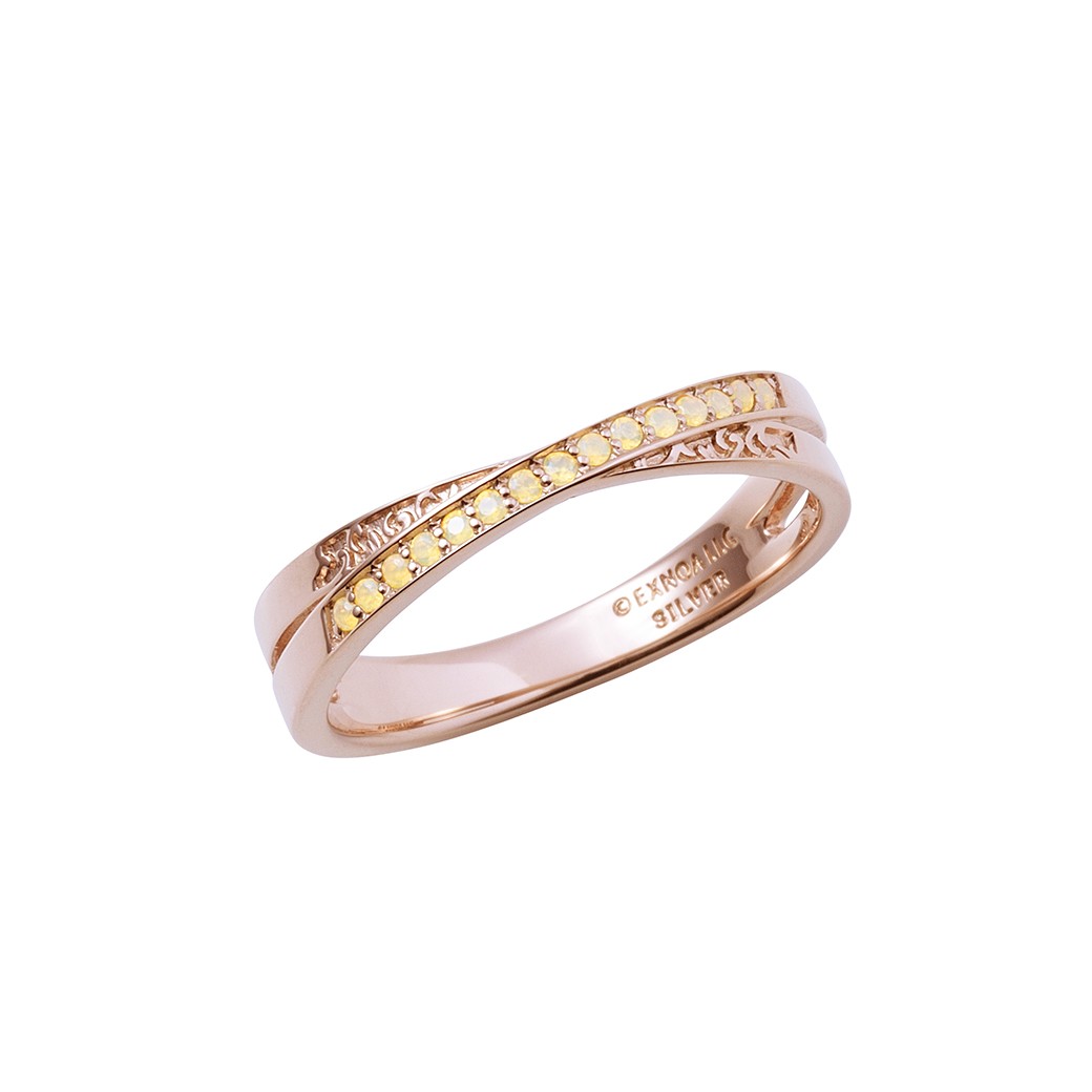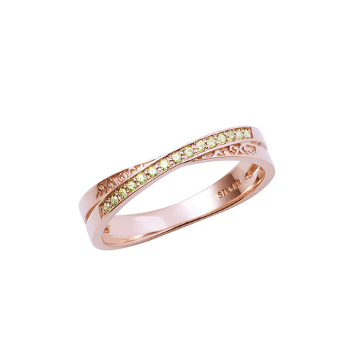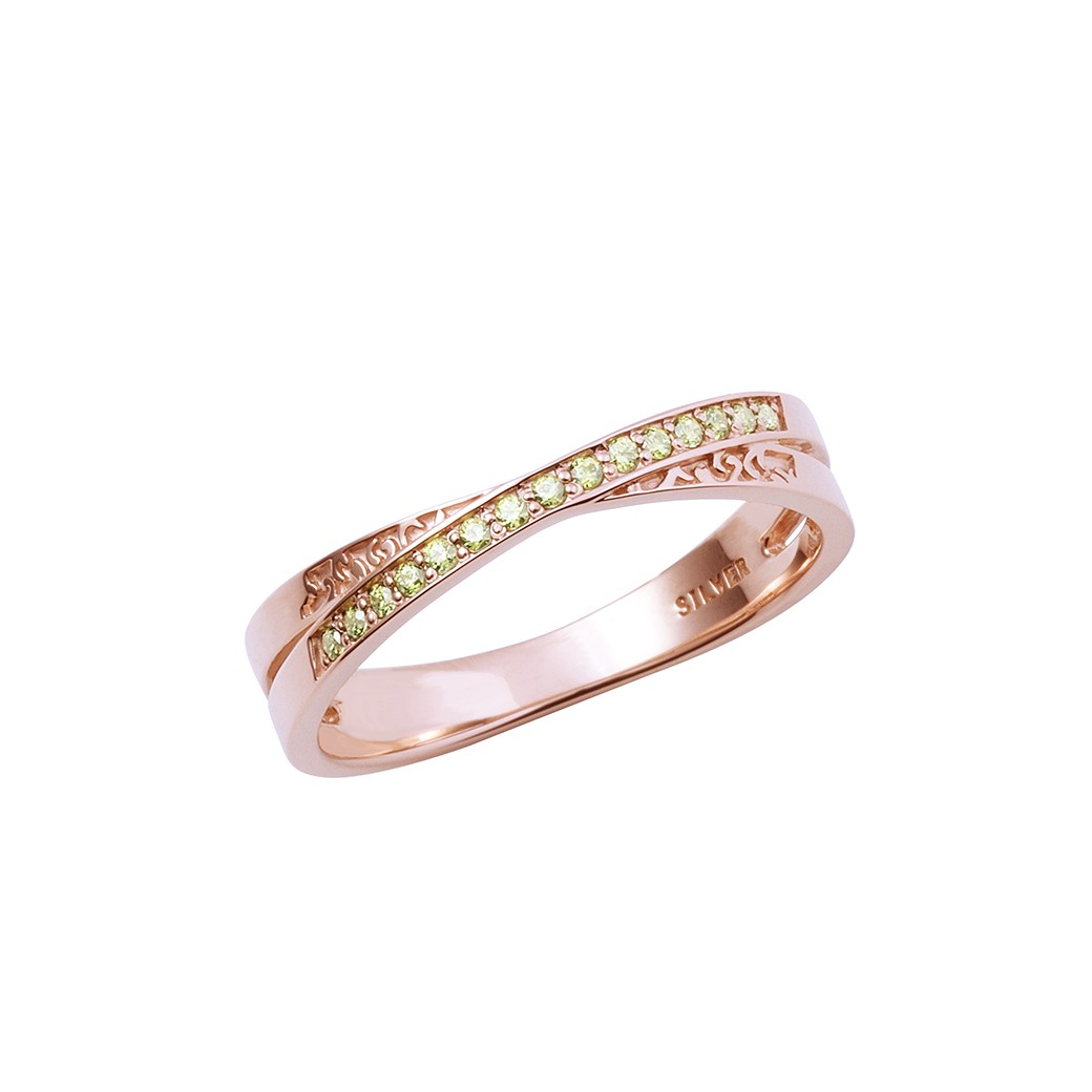 中野の指環(銃)はレトロなピンクゴールドコーティングを施した交差型に、イメージカラーストーンを配しました。さりげない彫りがお洒落なデザインです。
