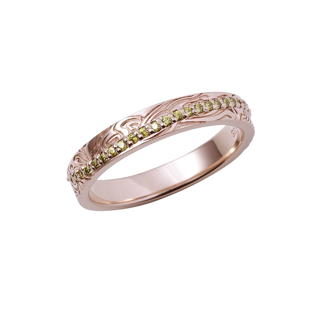 梶井の指環(鞭)はレトロなピンクゴールドコーティングを施した木目調のストレート型に、イメージカラーストーンを配しました。和柄で落ち着いた雰囲気のデザインです。
