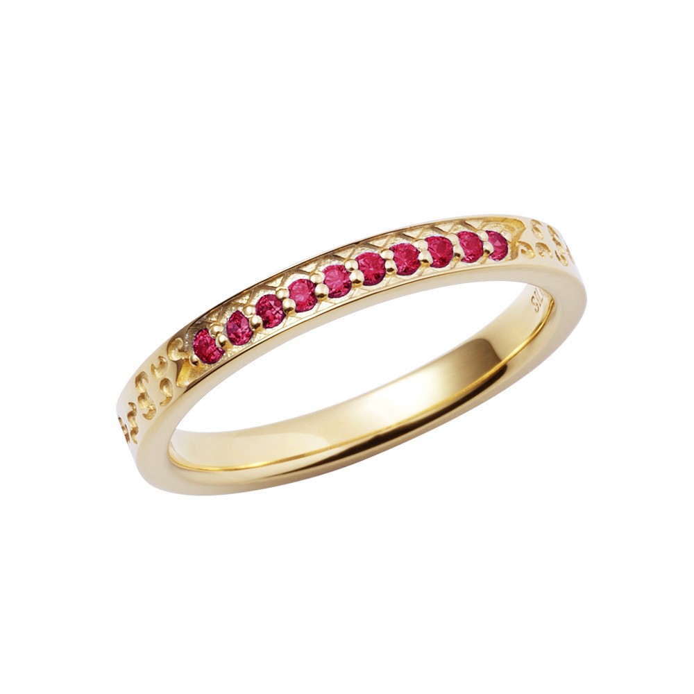坂口の指環(銃)はクラシカルなイエローゴールドコーティングを施したストレート型に、イメージカラーストーンを配しました。アンティーク調の柄がお洒落なデザインです。