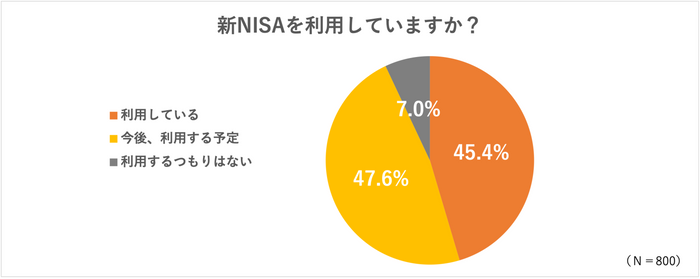2024年から始まった新NISA。本調査を行った2024年1月16日時点で、すでに新NISAを「利用している」と回答した人は45.4%と半数に届きませんでした。ただ、「今後、利用する予定」と答えた人が47.6%でしたので、合計すると9割を超える93.0%にのぼります。株式投資に取り組んでいる層にとって、新NISAへの関心はかなり高いようです。