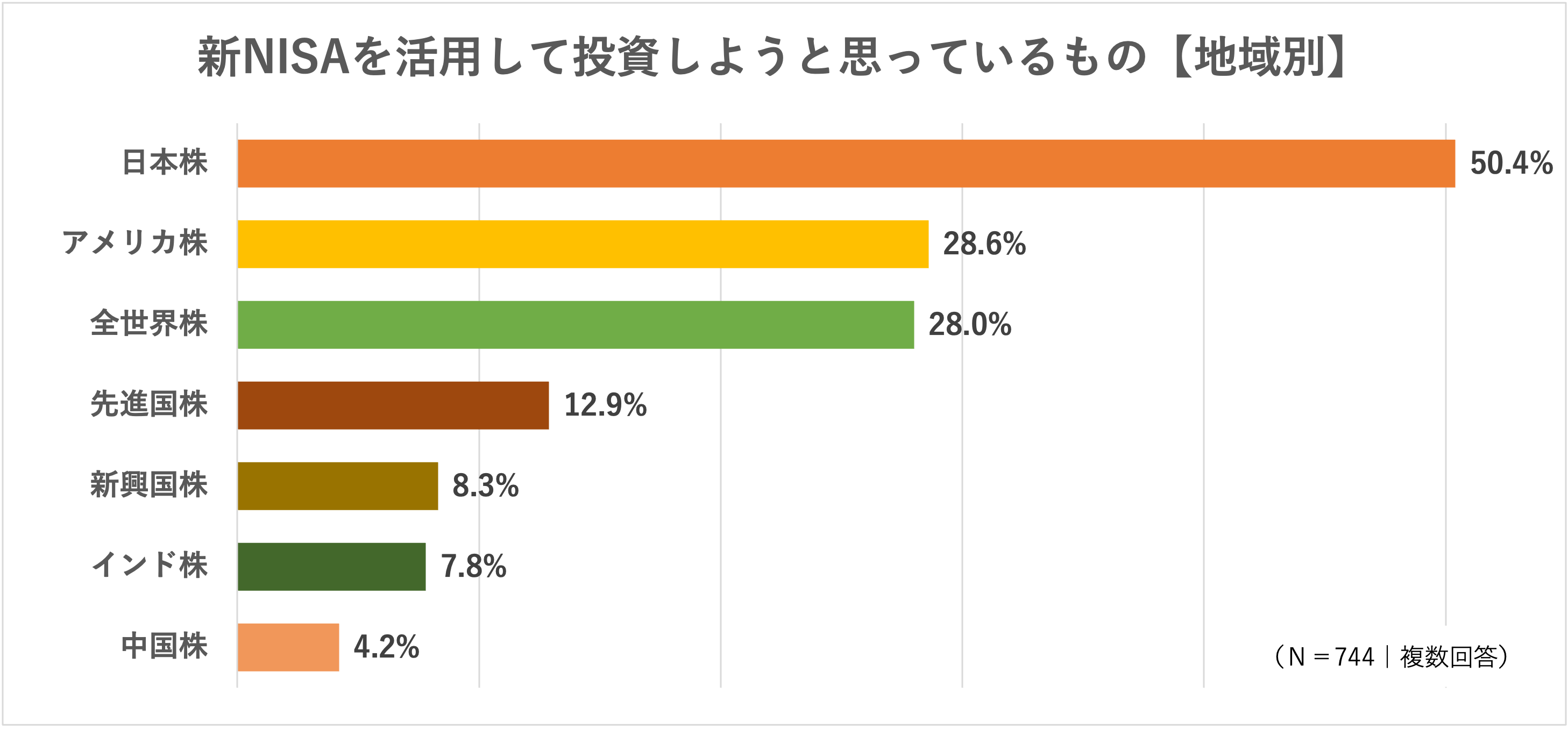 新NISAを活用して投資しようと思っているものについても調査しました。数ある選択肢の中から最も多くの票を集めたのは「日本株」で、新NISAを活用すると答えた(予定も含む)744人のうち、およそ半数にあたる50.4%の人が選びました(複数回答)。