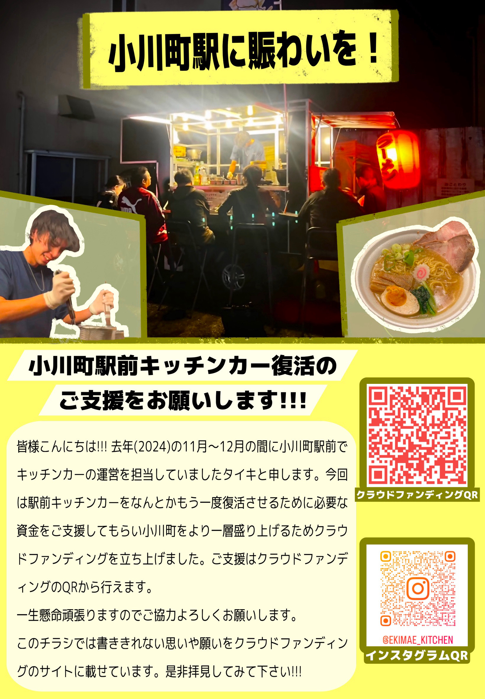 埼玉県小川町にて地域おこしを行う駅前キッチンカー(所在地:埼玉県比企郡小川町大塚171-7、店長:新井 太樹)は、「駅前キッチンカーから始まる小川町リメイク!!!」の支援募集をクラウドファンディングサイト「CAMPFIRE」にて2025年2月1日より開始いたしました。