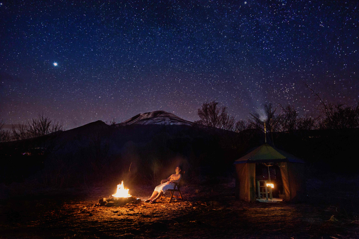 免疫力を高めることで、注目されているサウナ(*1)。本プログラムでは、トレッキングの到着地点である浅間山を望む高台にて、貸し切りの野外サウナを用意します。先ずは、薪ストーブで温めたテントサウナにて、高温と熱波に包まれるサウナ体験です。大量の汗をかき体内の熱を放出することで、脳の思考は限定的になり、余計なことを考えにくくなると言われています。次に、脈拍が通常時の約2倍になった後に行う、星空外気浴。冬の軽井沢は、夜間マイナス10度を下回ります。極寒の環境に驚いた身体は自律神経を調整しながら適応しようとします。この高温と氷点下の星空外気浴の交互浴を数回繰り返し、脳がめまぐるしい変化に対応することで、処理能力が高まり「ととのう」状態に到達します(*1)。やがて空が明るみ、朝日に照らされる浅間山を望む頃がクライマックス。野外サウナ体験を通して「ととのう」ことで、免疫力を高めていただくことを目指します。
