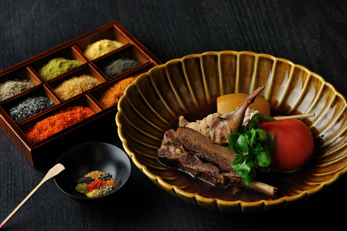 冬期限定の夕食献立「ジビエおでん」に、本プログラム限定で八幡屋磯五郎と協力して作るオリジナルブレンドの七味を合わせて提供します。鹿節(しかぶし)を使った鹿出汁で、5種類以上のジビエ肉と旬の野菜をおでんに仕立てる、ジビエおでん。ジビエ肉は、コラーゲンを多く含む猪肉や鉄分豊富な鹿肉(*7)など、栄養豊富です。免疫力向上食材として知られる生姜や唐辛子、山椒などの七味を加えることで、身体を温めながら栄養補給することができます。