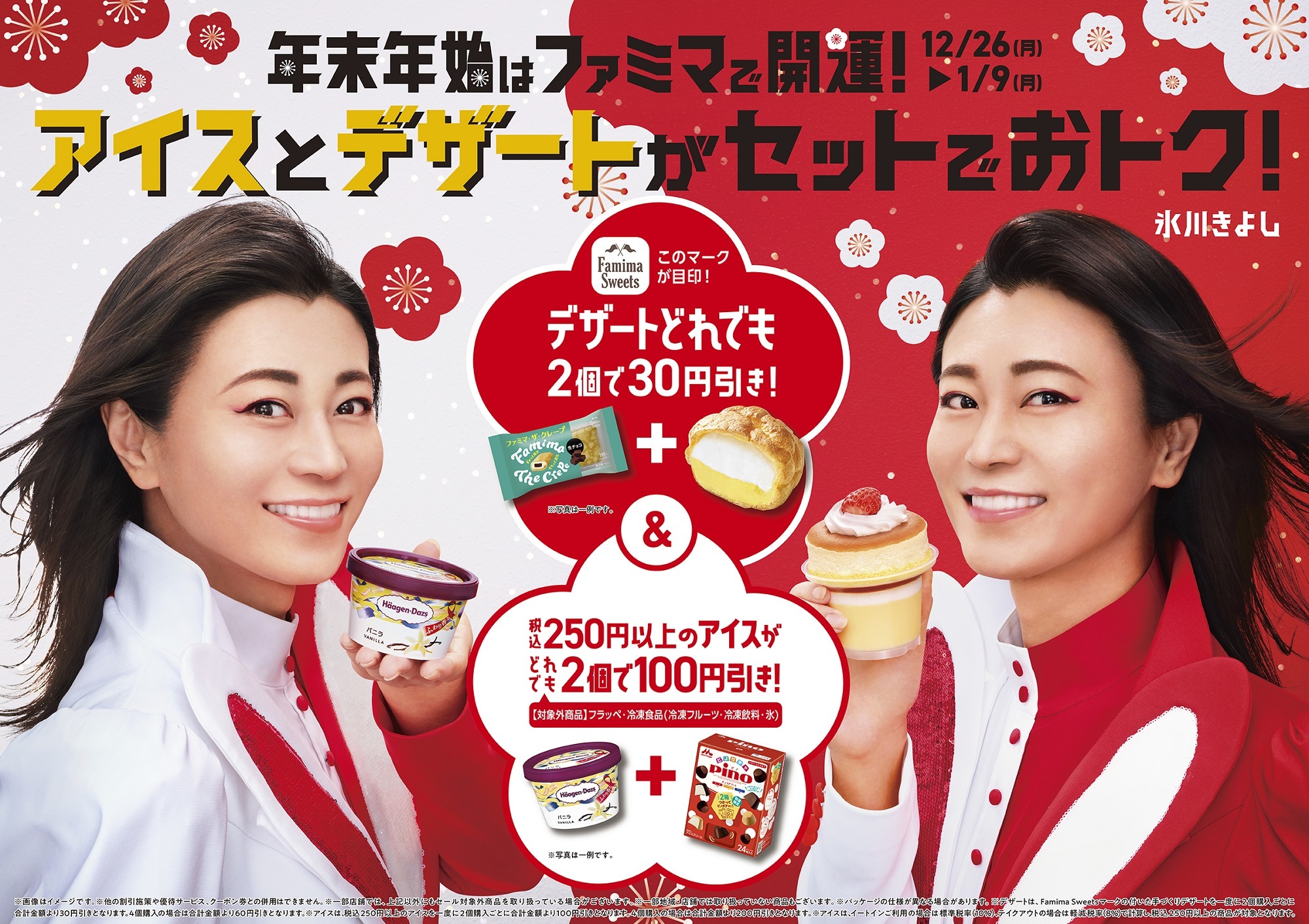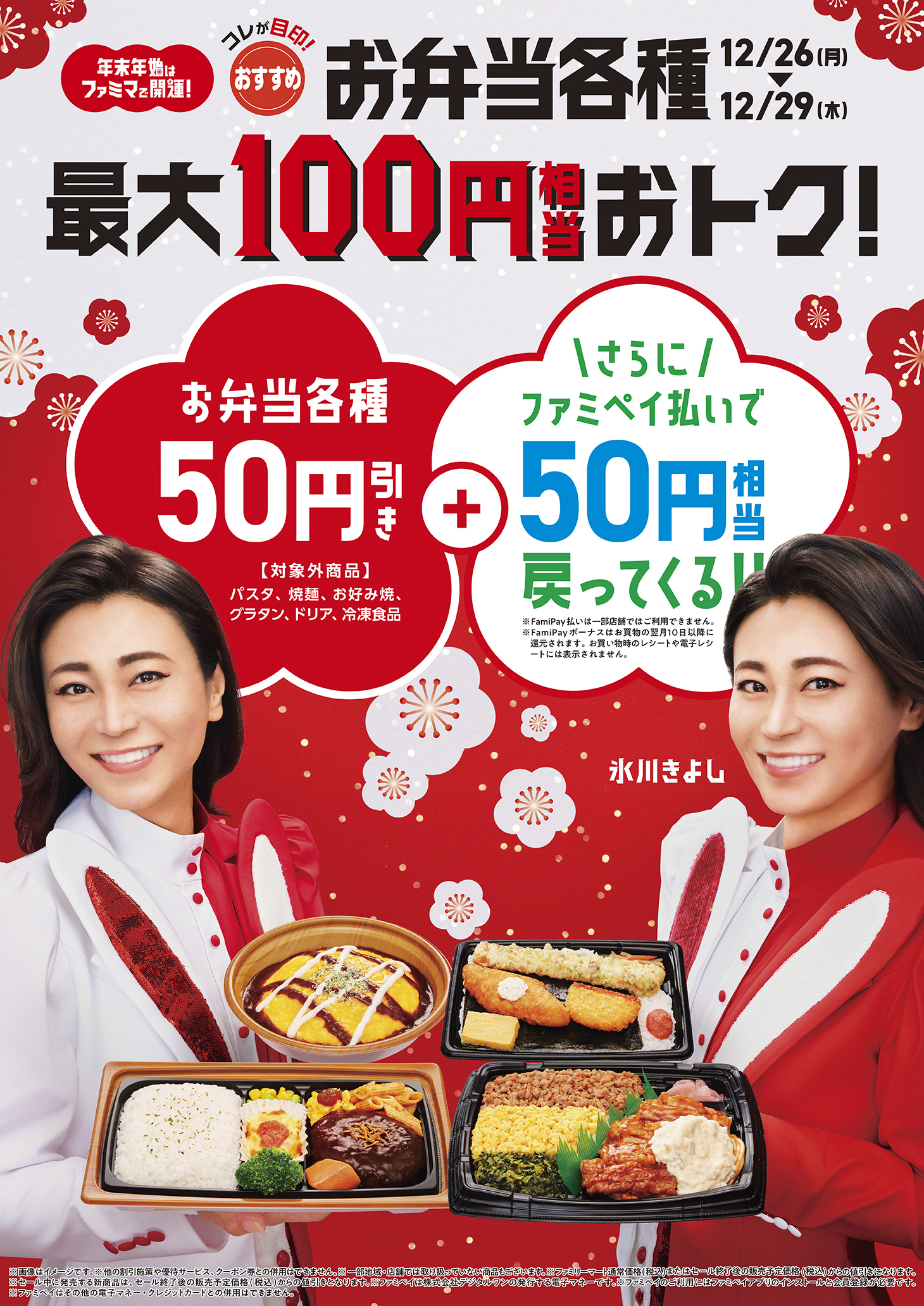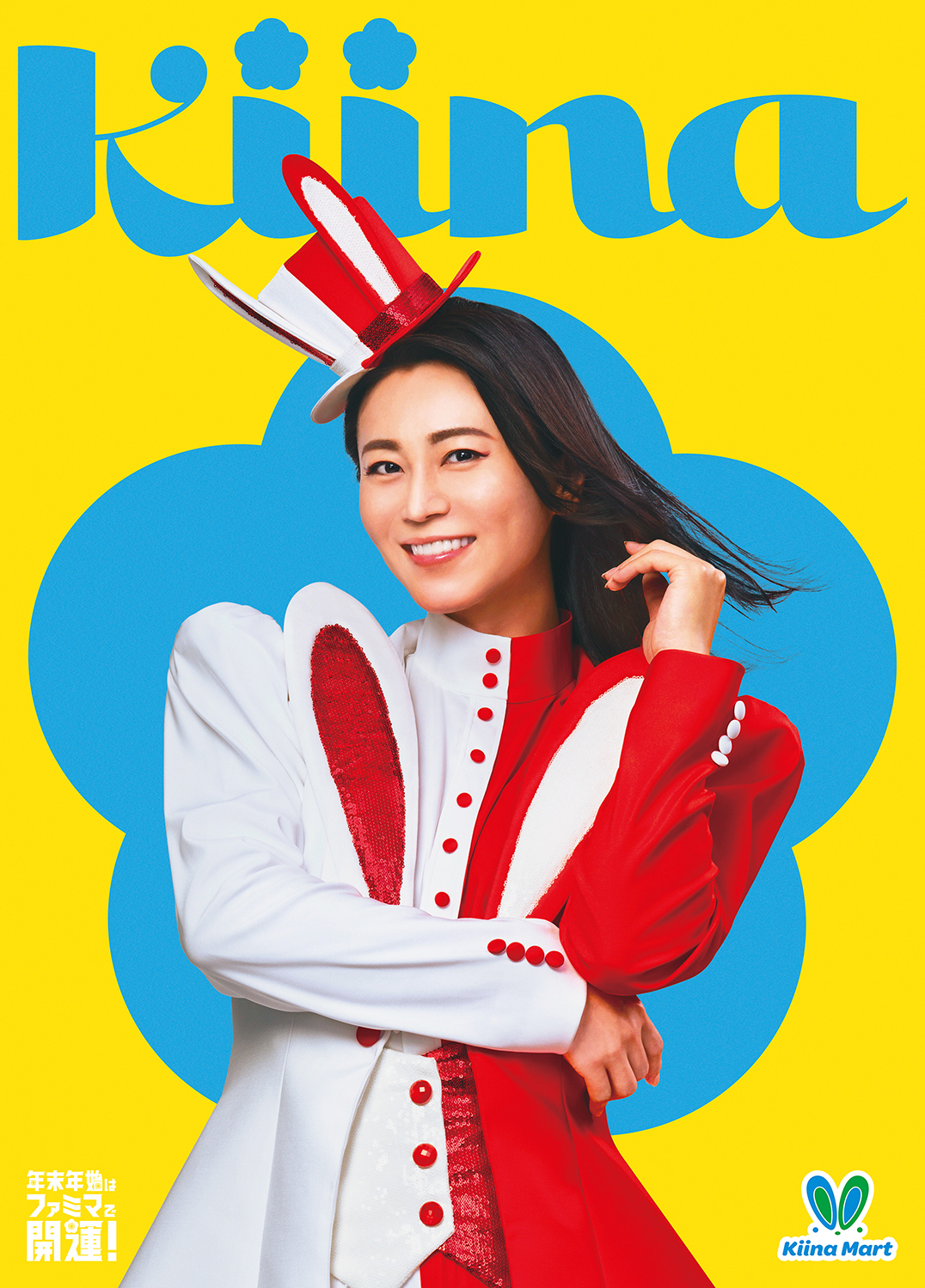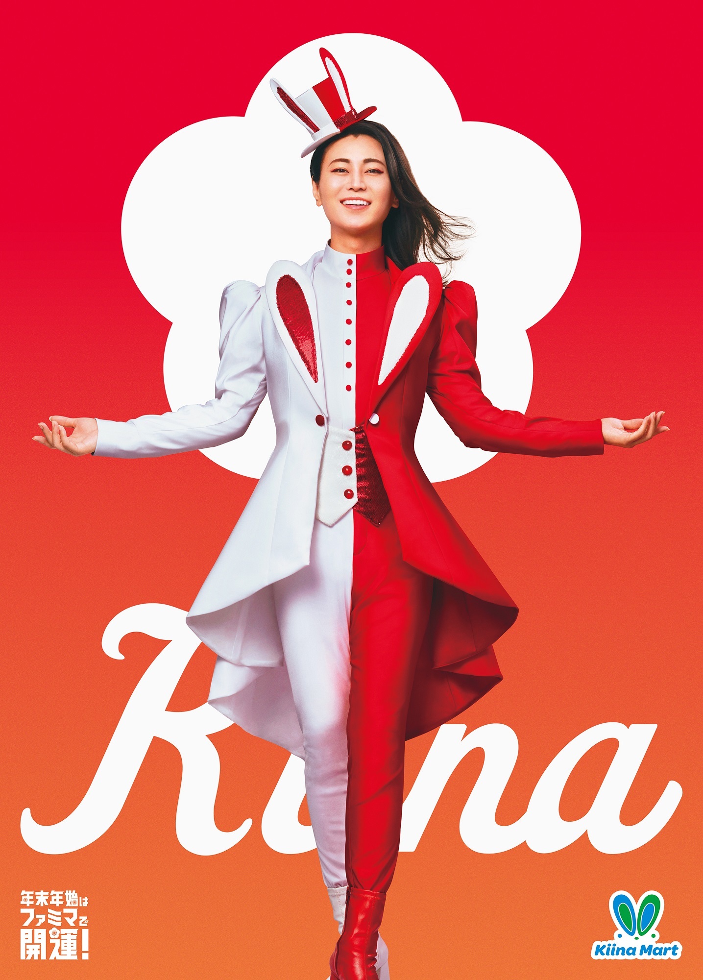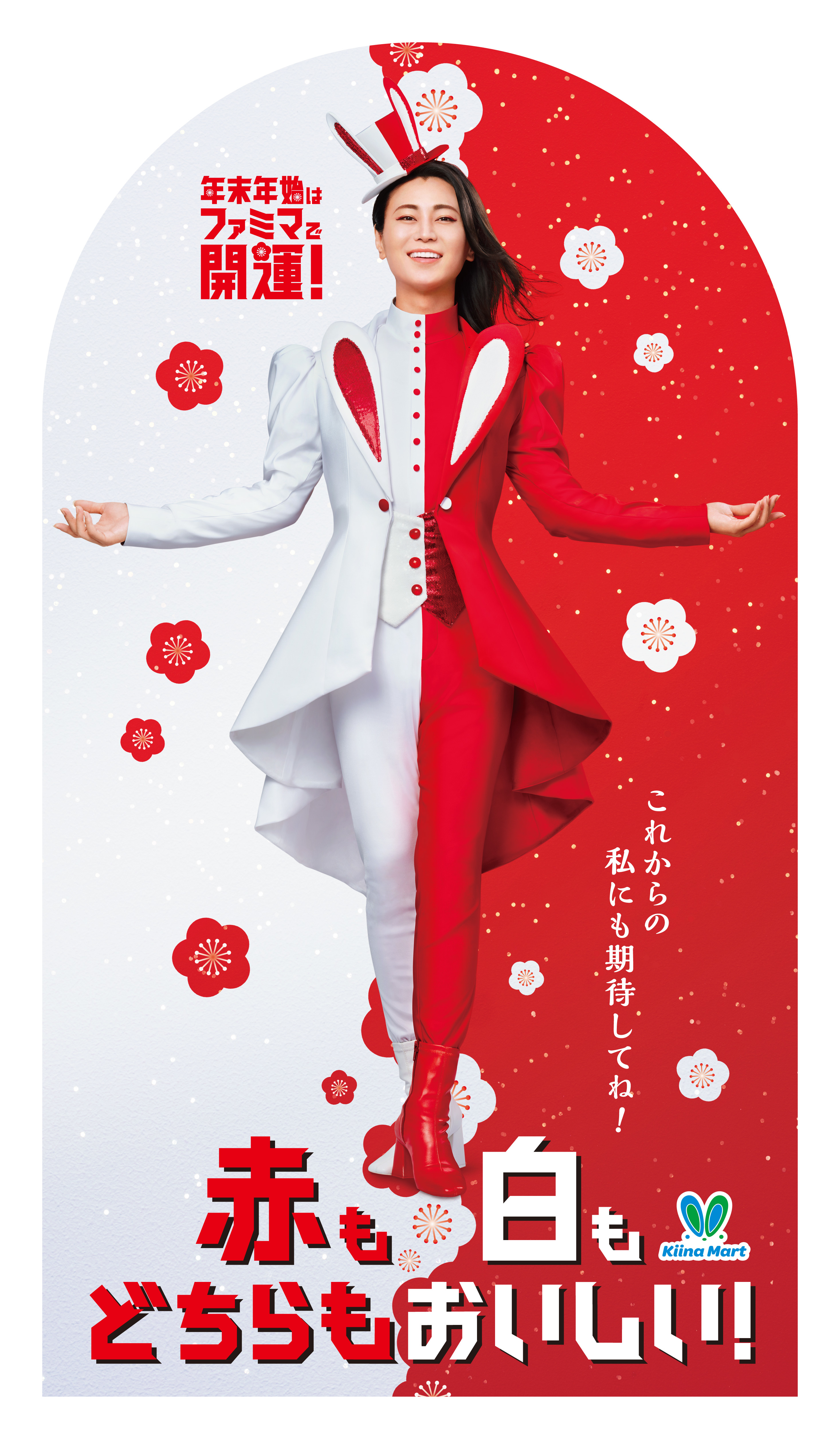 ファミリーマートでは、来年の干支であるウサギの耳を付けて縁起の良い紅白カラーの衣装をまとった氷川さんと様々な開運キャンペーンを実施いたします。