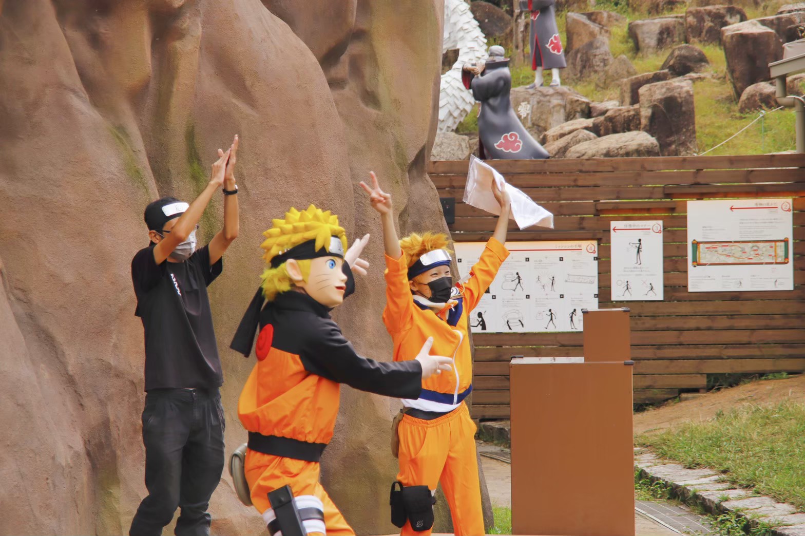 3つ目は、「チャクラ綱引き」です。ナルトが尾獣である九尾の狐“九喇嘛(くらま)”とチャクラを繋ぎ合わせることを表現したチャクラ綱引きをモチーフにした綱引きイベントとなっており、ナルトの誕生日である10月10日のアトラクションオープン時に開催。毎年、オープンをお待ちいただいているお客様たちとナルトに扮したスタッフたちが勝負!