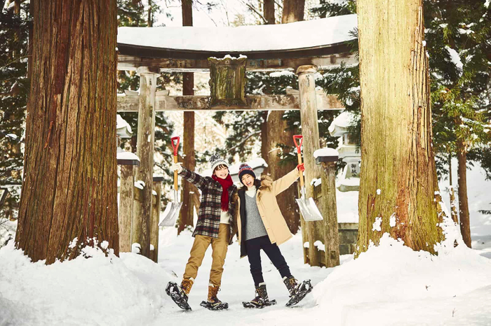 当ツアーの舞台となるのは、下北半島の恐山と共に、北東北の二大霊場と呼ばれる十和田神社です。春から秋にかけて観光客が絶えない場所ですが、冬は降り積もる雪により参拝するのも一苦労な状況です。そこで当ツアーでは、雪国ならではの体験として、雪に深く覆われた道をスノーシューで歩いたり、雪かきをしながら自分の新たな道を切り開きます。全身を使って楽しく雪かきをした後は、一度心と身なりを整え、十和田神社の象徴である龍の手水舎(てみずしゃ)で手や口を洗い清めます。ひと汗かいた後の参拝は、いつも以上に自分の心も清らかに、きっと思いも伝わるはずです。また、オプションとして珍しい木の御朱印帳や、力強い青龍の御朱印も持ち帰ることができ(有料)、新たな気持ちで1年のスタートをきることができます。