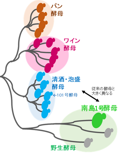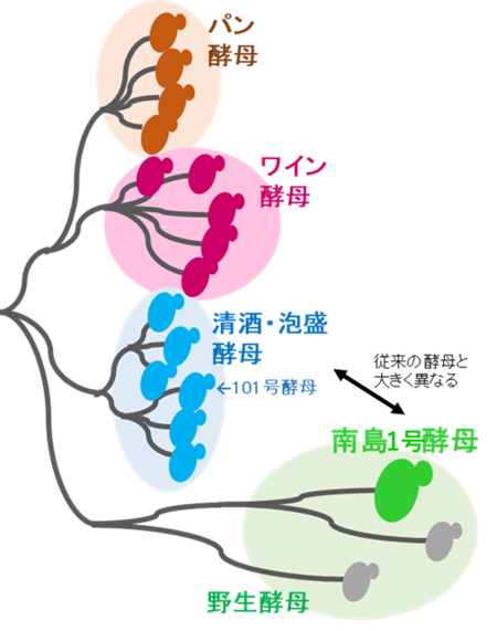 酵母は、パン・ワイン・清酒などに用いられ、それぞれがグループを形成していることがわかっておりますが、南島1号酵母は、沖縄の自然界から新たに採取された酵母となります。バイオジェットによる詳細な解析の結果、南島1号酵母は、従来の酵母と大きく離れた系統であり、全く新しい泡盛酵母であることが確認されました。さらに、南島1号酵母を用いて試験的に製造した泡盛は、従来の泡盛酵母と比較して、バニラ香やバナナのようなフルーティな香りを生成する能力が高いことが確認され、これまでの泡盛とは異なる、香り高い泡盛を醸造できると考えられます。