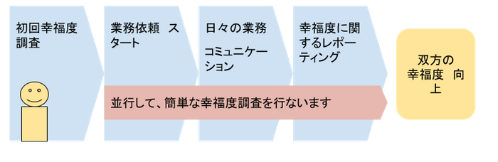 業務を遂行する担当が決まると、まず、業務の委託側・受託側の双方で幸福度調査を行います。