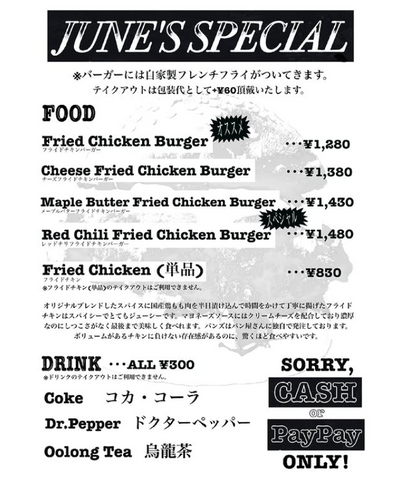 看板メニューは、スパイス香るジューシーなフライドチキンバーガー。国産鶏もも肉をオリジナルブレンドのスパイスに半日漬け込み、しっとり&スパイシーに仕上げました。衣にもスパイスを加えることで、香ばしさと旨みがさらに際立ちます。