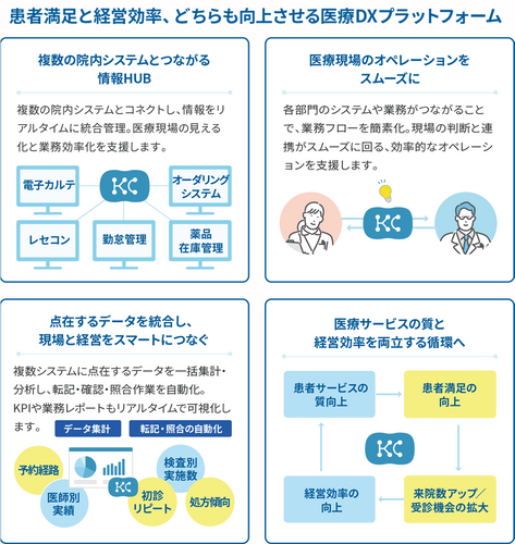 【KarteConnect】は、電子カルテ・レセコンなどのデータ活用やシステム連携によるオペレーションの効率化、患者とのコミュニケーション機会の創出などを支援し、現場におけるリソースの最適化や患者満足度の向上を実現します。