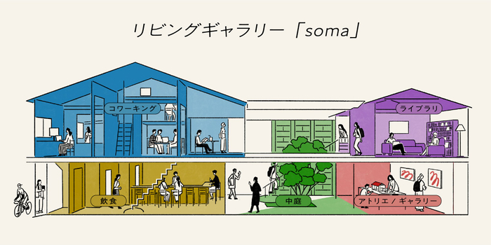『soma』が目指すのは、“リビングギャラリー”という新しい場のあり方です。ギャラリーとは本来、作品を飾るだけでなく、“問いを投げかける場”でもあります。ここでは「つくる」「見せる」「残す」という行為が、日常のなかで交差しながらにじみ出し、施設全体が現在進行形の“生きたギャラリー”として機能していきます。