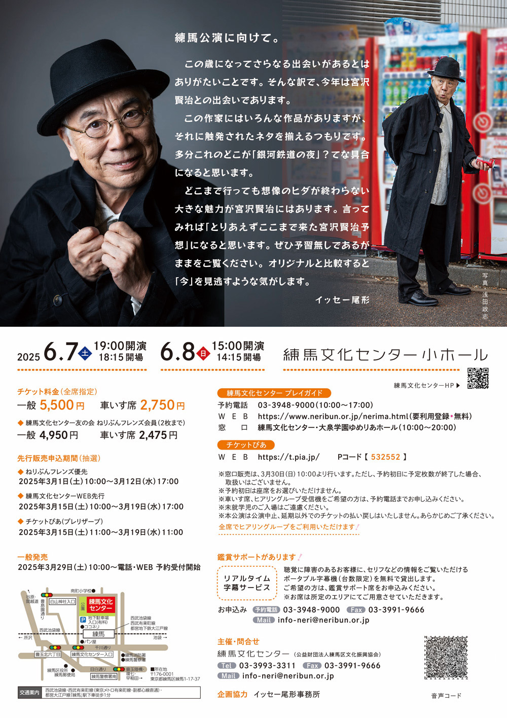 イッセー尾形の一人芝居公演、今年は宮沢賢治作品をテーマに 練馬文化センターからお届けします!
