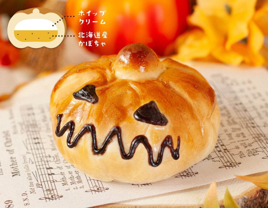 商品特徴:ジャック・オ・ランタンの中には、北海道産かぼちゃ餡とホイップクリームがたっぷり♪キュートなパンで、ハロウィンを楽しんじゃおう!