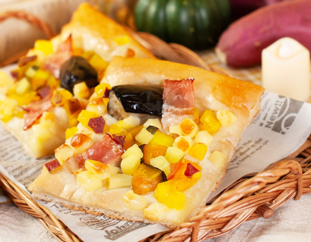 商品特徴:秋の味覚!かぼちゃ、さつまいもをのせた季節のフォカッチャ。ベーコンとチーズの塩味が食欲をそそります♪