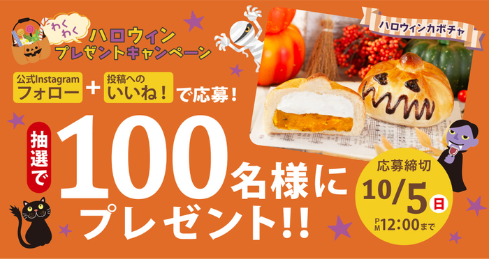 9月26日(金)にペンギンベーカリー公式Instagramへ投稿されるキャンペーン画像に「いいね!」をして、専用フォームよりご応募いただいたお客様の中から抽選で、北海道産かぼちゃ餡とホイップクリームがたっぷり入った『ハロウィンカボチャ』を100名様にプレゼントいたします。