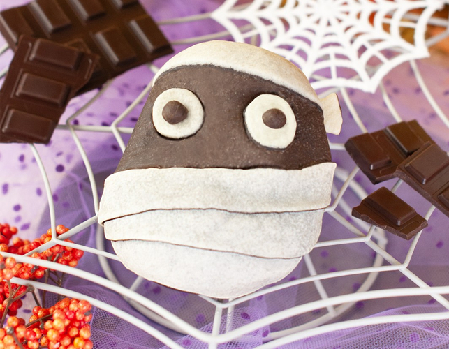 商品特徴:ぐるぐる包帯を巻いた怖かわいいミイラが登場!中にはチョコクリームが入っています。