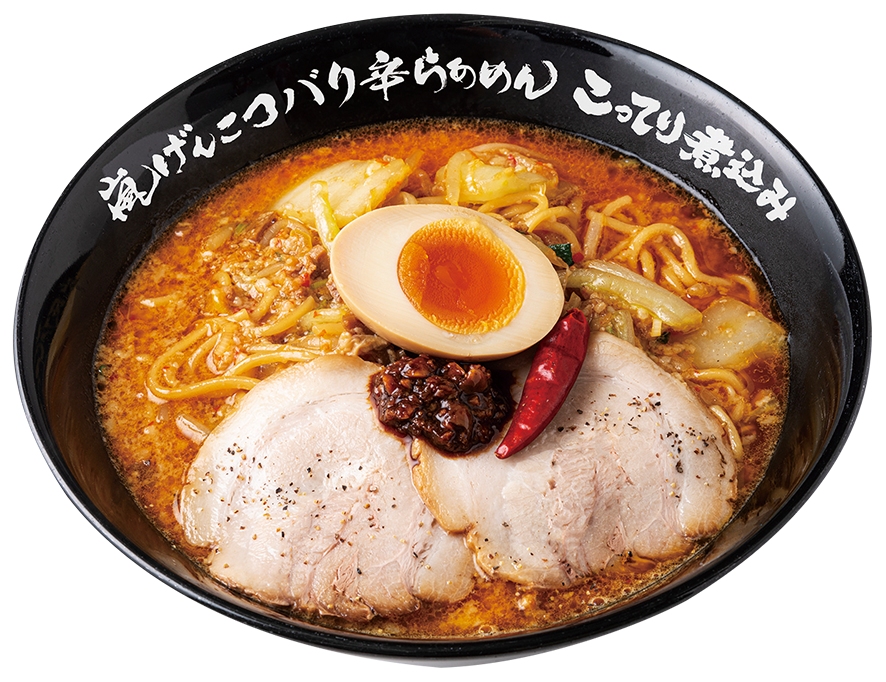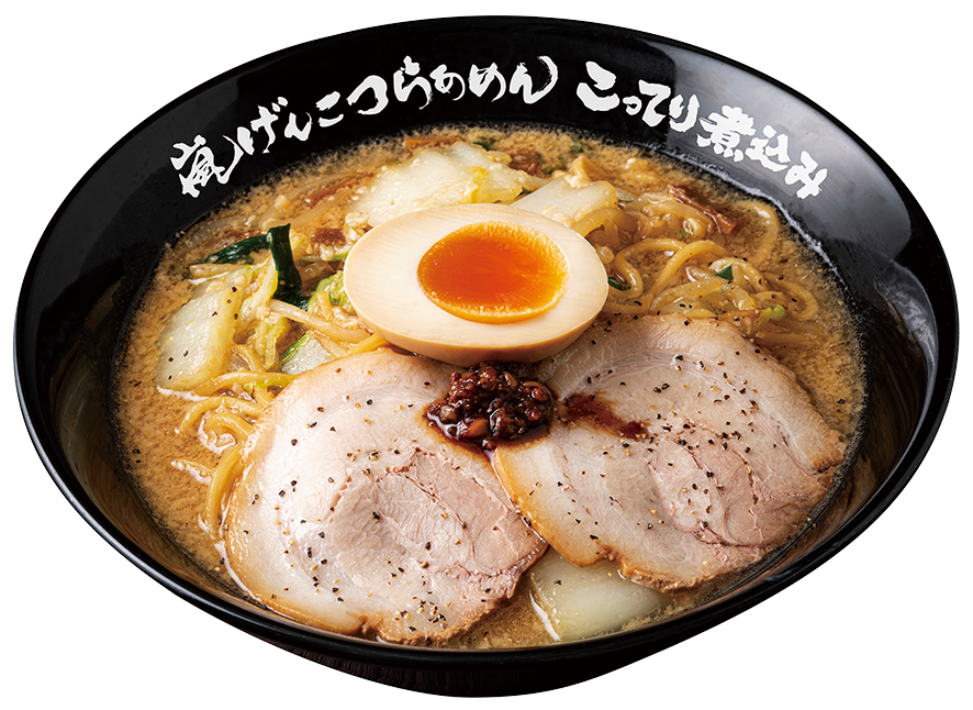 「秘伝のタレ×げんこつスープ」の濃度を極限まで濃縮させた“こってりげんこつスープ”で煮込んだ中太麺と、ボリュームたっぷりの煮込み野菜(もやし・白菜・ニラ・ネギ)。