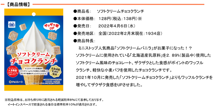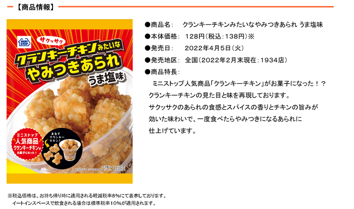 ミニストップは、季節の売場変更に合わせ、ミニストップオリジナル菓子の新商品「Xフライドポテトみたいなポテトスティックスパイシーバーベキュー味」 (税込価格:138円)※をはじめ、2022年4月5日(火)に3品、4月6(水)に4品、4月12日(火)に1品、計8品を国内のミニストップ店舗にて発売します。