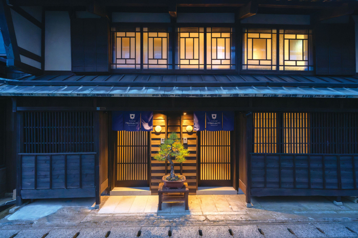 歴史ある町家(かぐら建てや日本の伝統的な建築様式)を改装。外観は袖壁などを生かし、笏谷(しゃくだに)石を敷き詰めた玄関など純和風の造りのお宿。