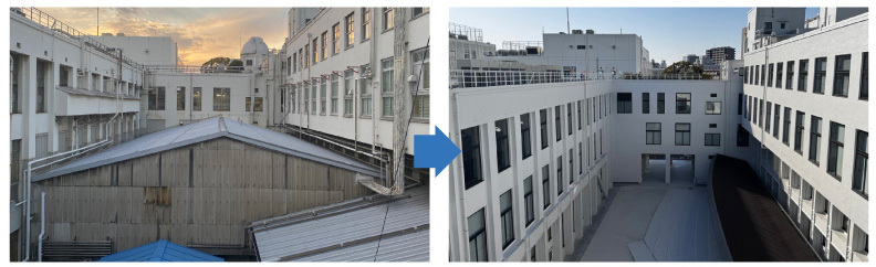 しかし、長い年月の中で実用性が優先された時期には、外壁に配管が露出したり、中庭に設備が増築されるなど、当初の設計思想が損なわれる状況となっていました。