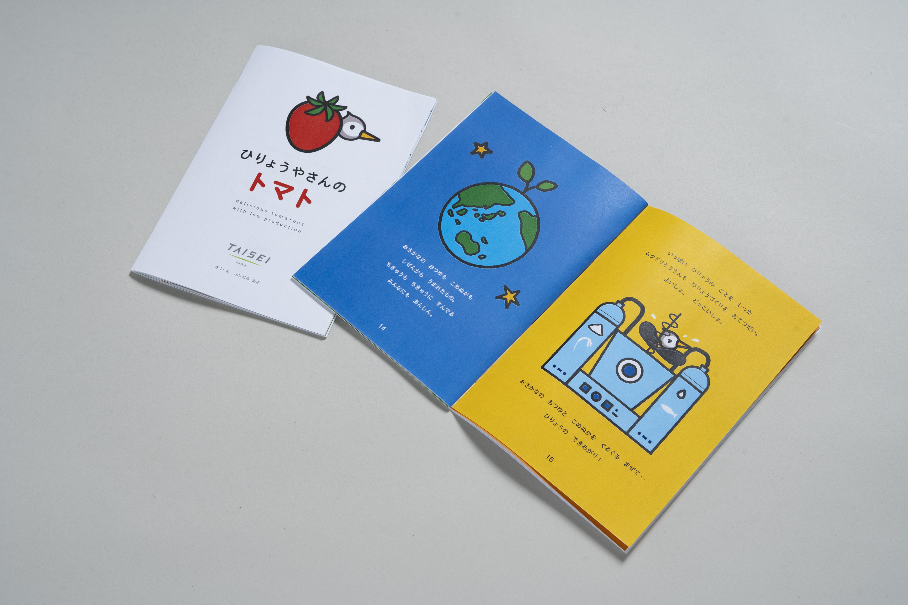 有機肥料メーカーの大成農材では、三原市大和町にある自社農園大成ファームにて、全国の生産者より高い評価を得ている自社の有機肥料を使ったミニトマトの栽培を行っています。2020年11月には、自社ECサイトにて「ひりょうやさんのトマト」ブランドとして販売を開始。その際に、栽培やおいしさの秘密を分かりやすく伝えるため、食育を目的としたオリジナル絵本「ひりょうやさんのトマト」を制作し、商品購入者やイベント来場者に無料で配布してまいりました。