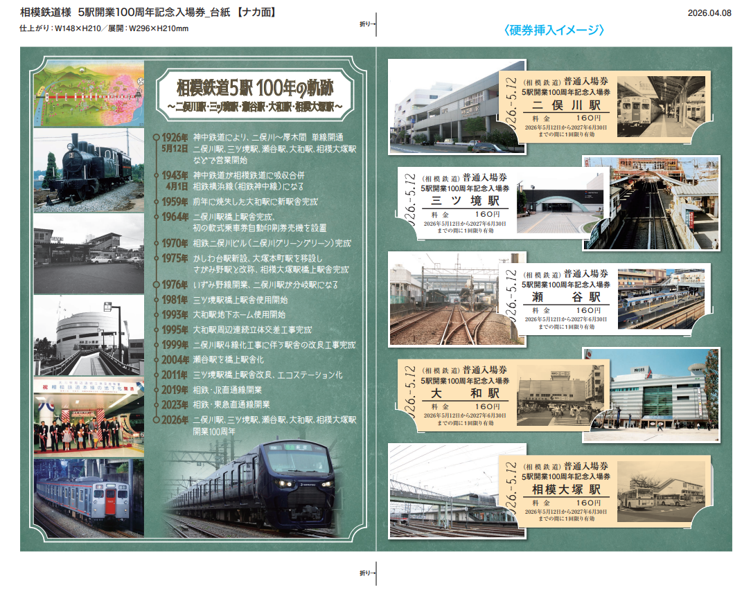 同入場券セットは、同区間の開業と同時に営業を開始した相鉄線5駅(二俣川駅、三ツ境駅、瀬谷駅、大和駅、相模大塚駅)の「D型硬券普通入場券」を特別仕様の専用台紙にセットしています。開業当時の懐かしい駅舎の姿や車両の写真、1世紀にわたる歩み「100年の軌跡」を掲載しています。
