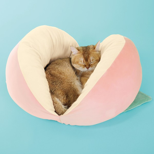 「桃太郎もとろけるベッド」は、桃の中に入り込んだようなユニークなデザインが特長のペット用ベッドです。大きく開いた桃のフォルムがペットの体をやさしく包み込み、落ち着いてくつろげる空間をつくります。