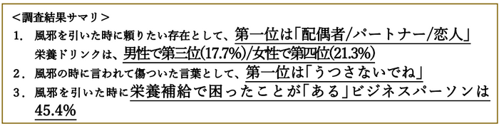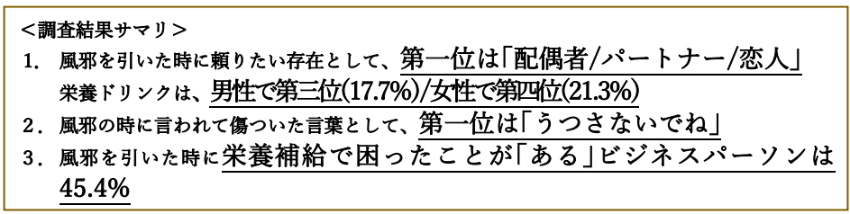 第四弾となる今回は、20代から60代の有職者1,200名を対象に行った、風邪を引いた時「頼りたい方」、「家族や恋人、配偶者に言われて傷ついた言葉」を調査で明らかにしました。風邪を引いた時に頼りたい方/物を伺ったところ約半数の方が「配偶者/パートナー/恋人」と回答しました。一方で「家族や恋人、配偶者に言われて傷ついた言葉」を伺ったところ、「うつさないでね」となり、約2割の方が実際に言われて傷ついたと回答しました。風邪を引いた際に頼りたい存在である「配偶者/パートナー/恋人」ですが、言われる言葉によっては逆に傷つけられてしまうことがあることがわかりました。また風邪を引いた時に「栄養を補給する方法で困った/苦労した経験があるか」をお伺いしたところ、45.4%のビジネスパーソンが「ある」と回答しました。