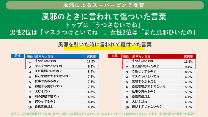 男女別の第二位では、男性:「マスクつけといてね」、女性:「また風邪引いたの」