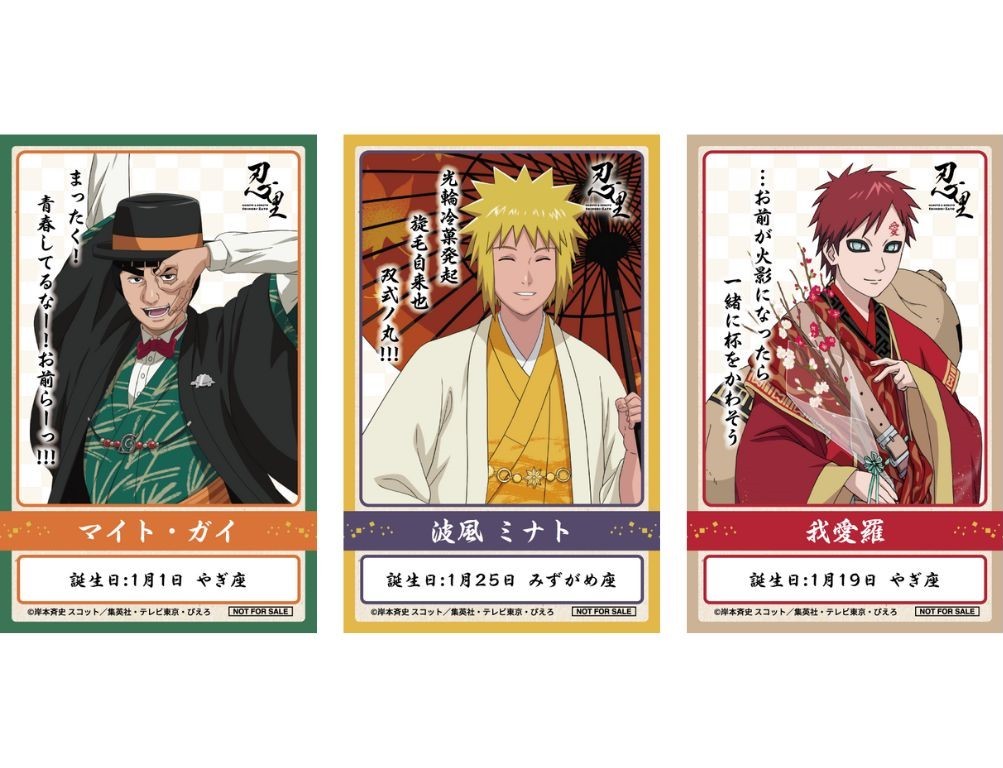 本イベントでは毎月、忍里限定の描き下ろしイラストを使用した、オリジナルバースデーステッカーをプレゼント。1月は、「マイト・ガイ」「我愛羅」「波風ミナト」をお祝いします!