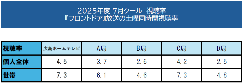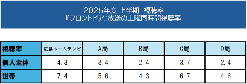 広島ホームテレビ(本社:広島市中区)で毎週土曜ごご1時から放送、ひろしま深掘りライブ「フロントドア」は、2025年の上半期視聴率で個人全体の同時間帯1位を記録。(9半期連続)その他、9月月間視聴率、7月クール視聴率においても同時間帯1位を獲得しました。(ビデオリサーチ調べ、広島地区)
