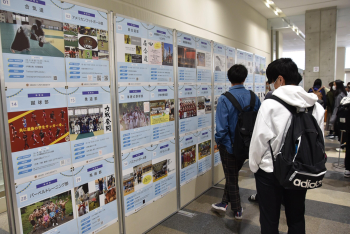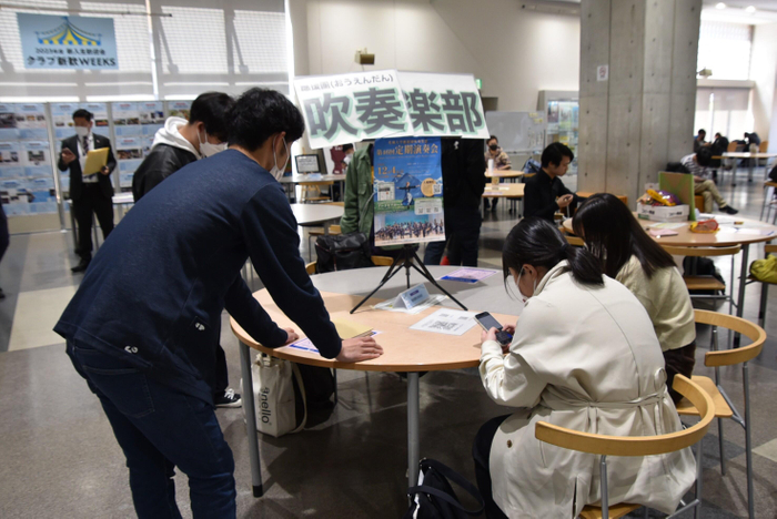 タワー75の2階学生ホールでは4月28日まで、先輩たちに直接質問ができるクラブごとの勧誘ブースが設けられ、先輩たちから活動内容などを聞く新入生でにぎわっています。活動日や活動場所、連絡先、SNSの情報が掲載されたポスターも掲示され、多くの新入生が熱心に見ています。