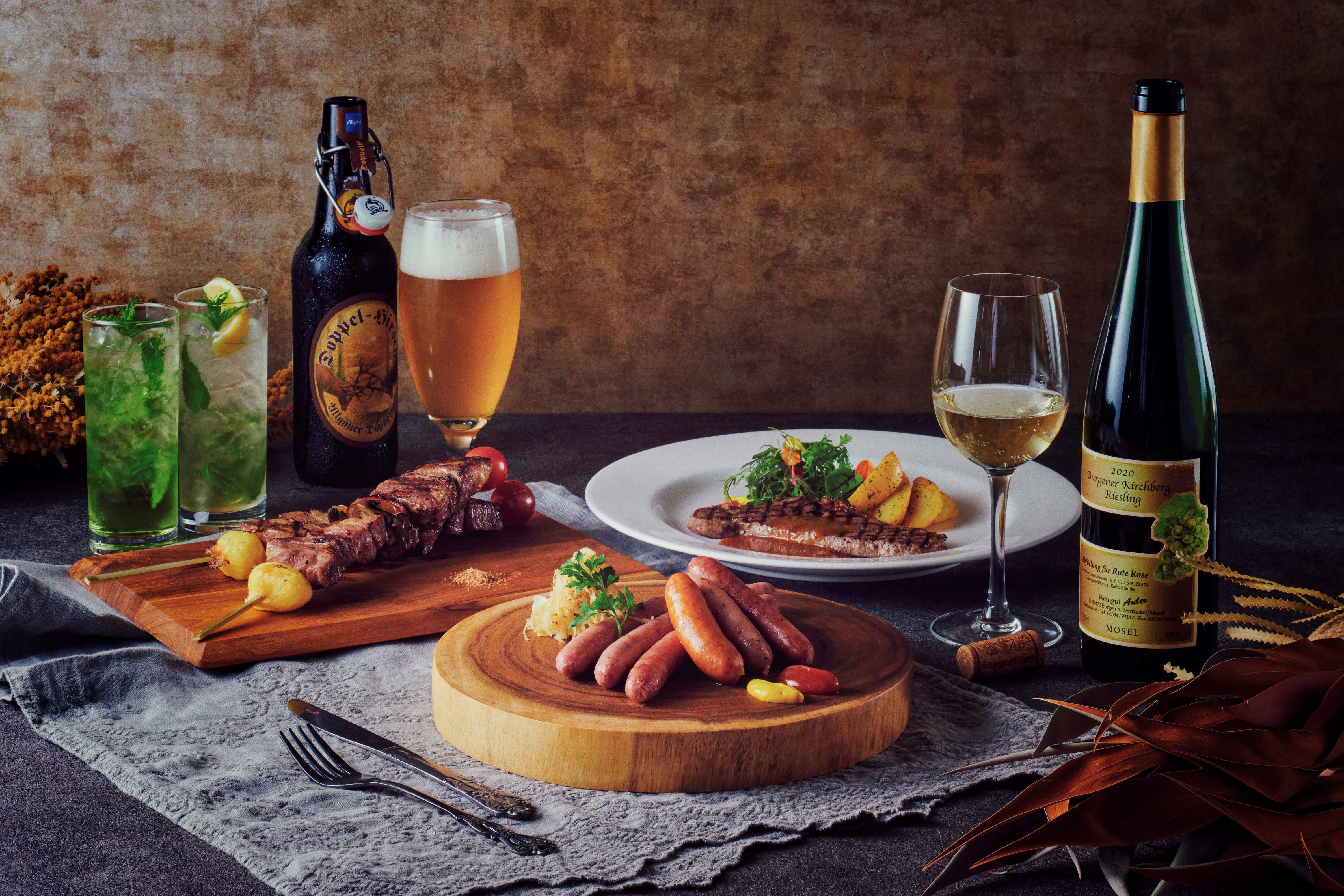 神戸ガーデンテラスバーを取り囲む古城(建物)や空間は、ドイツの古城「ヴァルトブルク城」をモチーフにしていることから、ハーブ園ならではの夏限定ドリンク「布引モヒート」を筆頭に、本場ドイツの醸造所のビールや神戸・北野の老舗ワインハウス「ローテ・ローゼ」がおすすめするワインを、スパークリングから、白、赤ワイン、デザートワイン、キンダーワイン(ワインになる前のぶどうジュース)と贅沢に取り揃えています。ドリンクにぴったりのフードとあわせて楽しいひとときをお過ごしください。