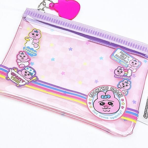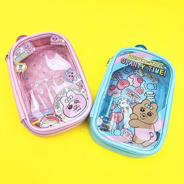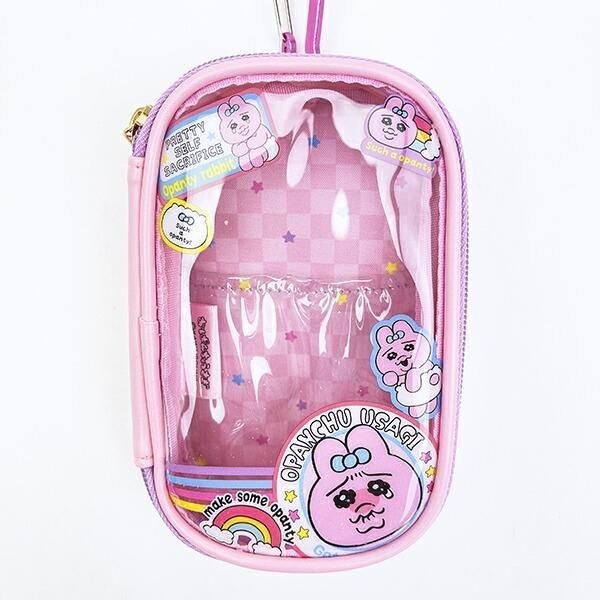 こちらはおぱんちゅうさぎのキャリーポーチです。クリアな素材は、中身が見えるので推し活にもぴったりで推しぬいやアクスタを入れたら、おぱんちゅと一緒に映えますね!