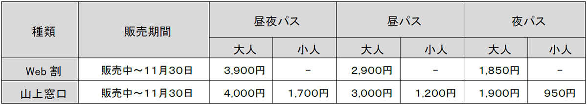 【料金】上記、夜パスまたは昼夜パスのとおり
