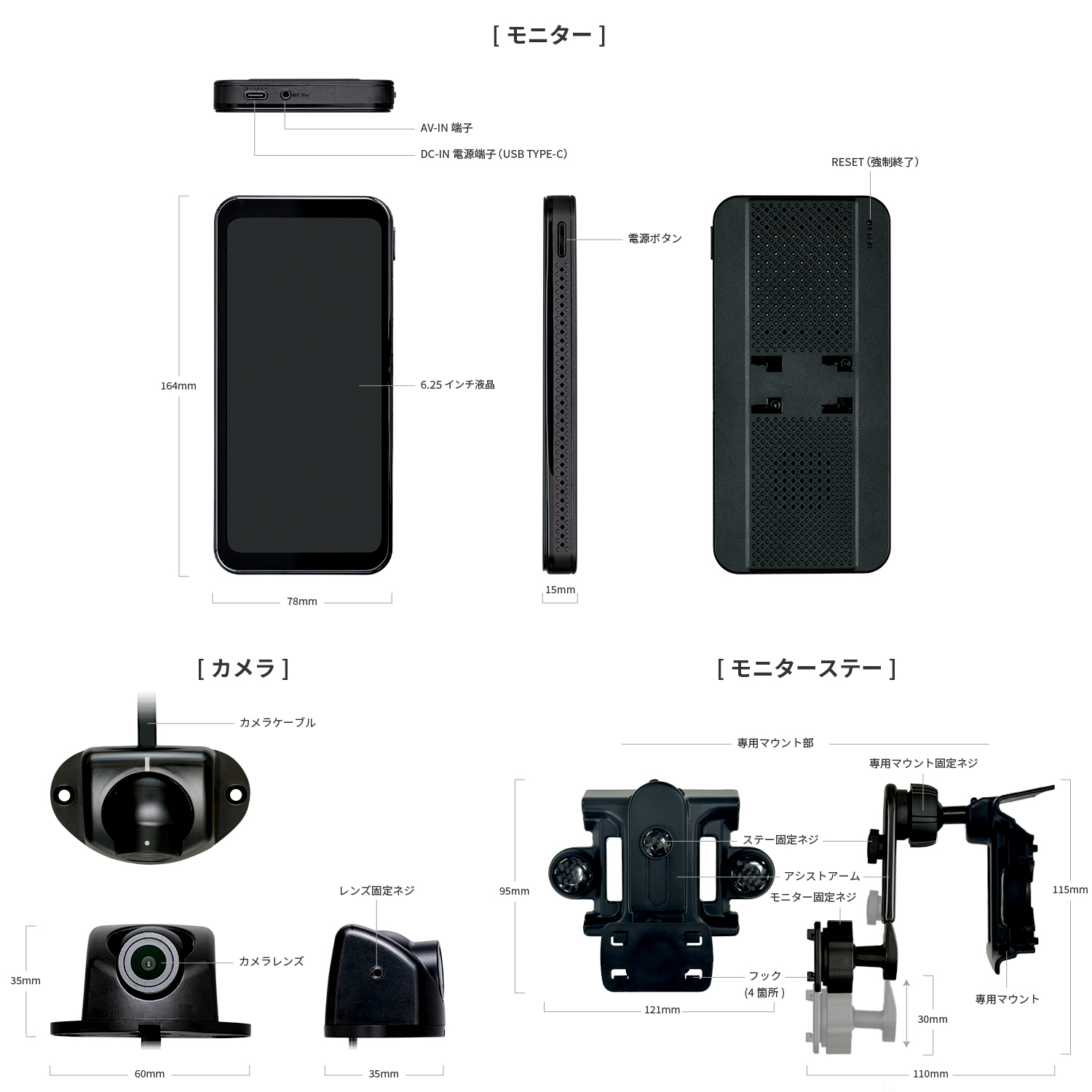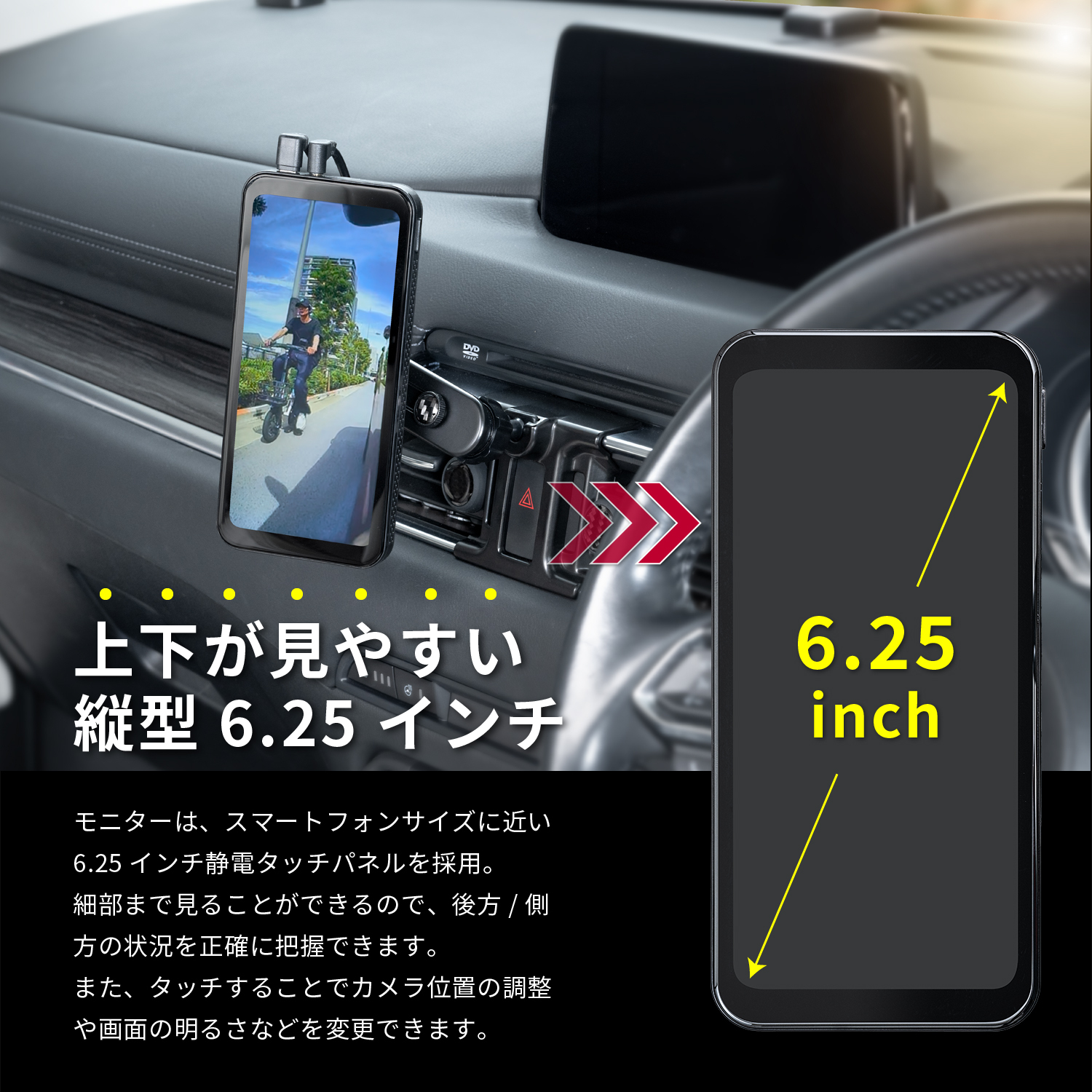 ● スマホサイズの6.25インチ液晶(112万画素)を採用し、色彩や路面の障害物をはっきりと確認でき、死角の状況を正確に把握できます。