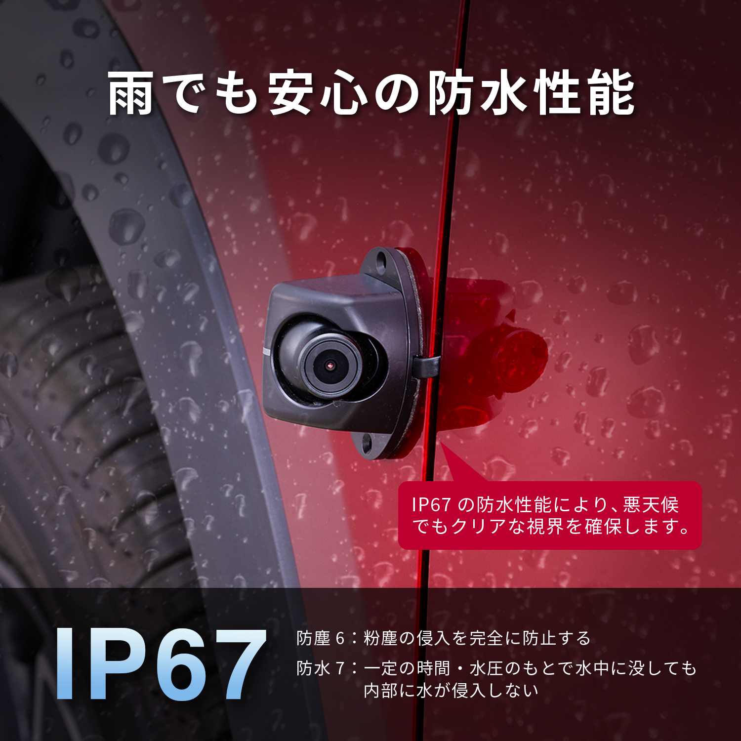 ● カメラレンズは角度調整が可能で、撮影角度を微調整できます。さらに、高フレームチューニング(50fps)により、滑らかな映像を実現し、IP67防水仕様で雨にも強い設計です。