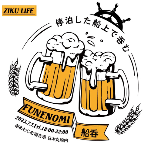 内容:停泊中の日本丸で船内パーティ「船呑~FUNENOMI」を開催。ZIKU LIFEとのコラボレーションで入場無料。音楽とお酒とツマミを楽しむ特別な一夜をお楽しみいただけます。