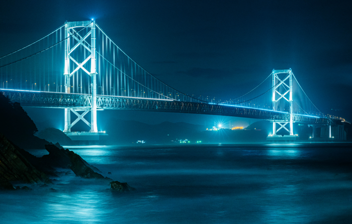 新咸臨丸で星空が見やすい阿万沖まで進み、客室内でモニターと使ったプラネタリウムを鑑賞後、デッキで星空とプロの星座解説を楽しみます。さらに鳴門海峡では大鳴門橋と海面をLEDライトで照らし神秘的な景色を体験出来ます。