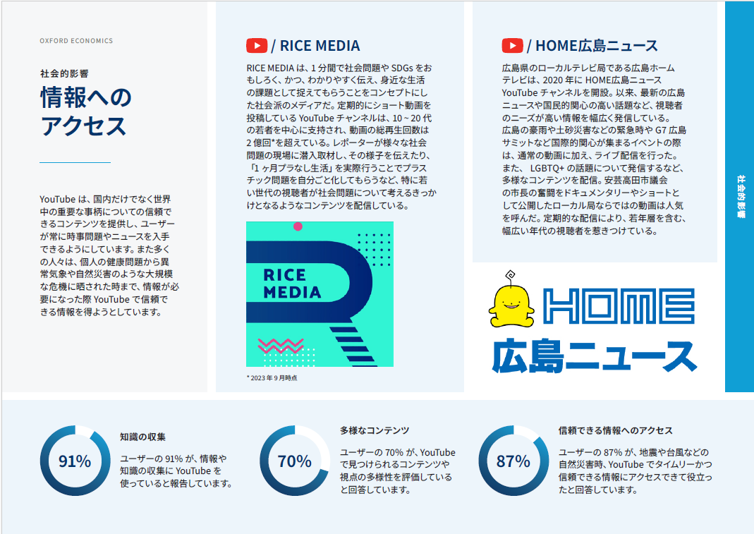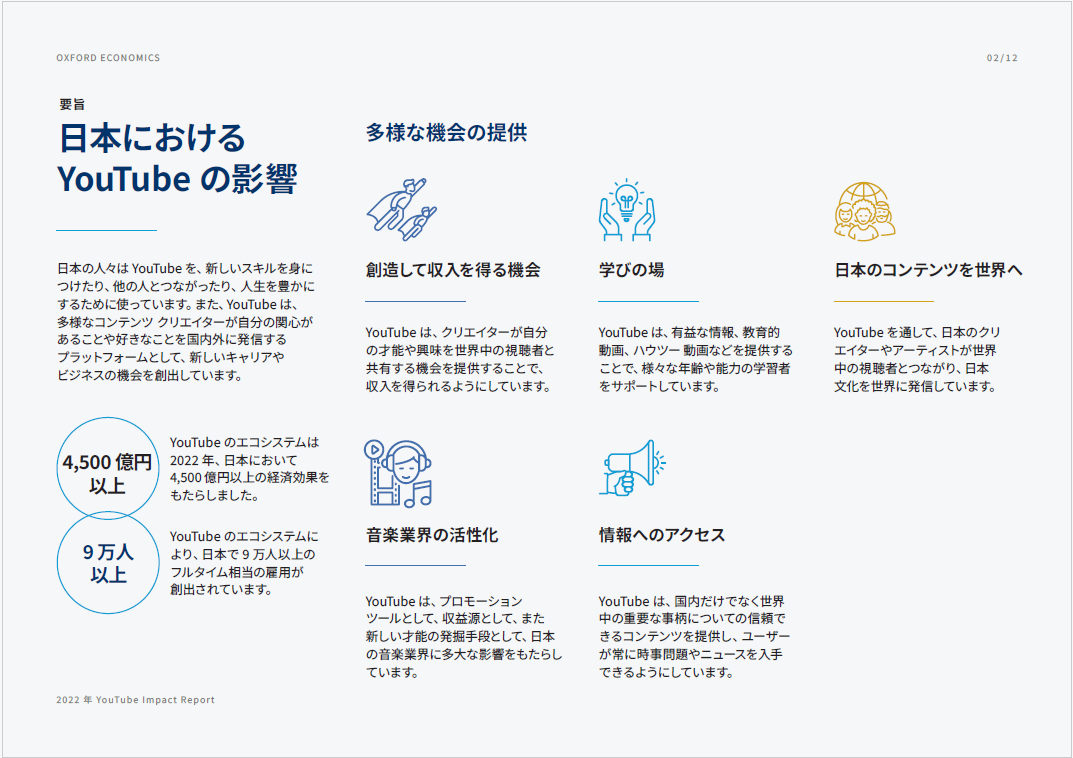英国の独立系コンサルタント会社であるOxford Economicsが2022 年(1月~12月)のYouTube がもたらす経済的、文化的、社会的影響の調査結果をまとめたものです。具体的なYouTubeチャンネルを用いて事例が紹介されています。このレポートは日本版YouTube公式ブログに掲載され、一部のプレスや政府関係者に印刷物として配布されます。