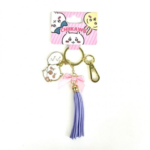 パープルのオシャレなタッセルが付いた、ちいかわのキーホルダーです。リングには、ちいかわの可愛いチャームが見えますね♡さらに、タッセルにはピンクのサテンリボンも施されていて、ガーリーテイストです。